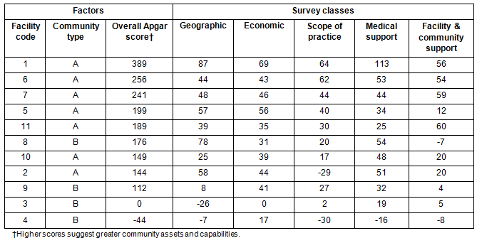 The overall rank ordering of classes by mean Community Apgar scores in these Idaho communities was as follows: medical support, economic, geographic, facility/community support and scope of practice. This may reflect the structure and financing of the CHC entities being better supported for their provision of a more limited scope of services as compared to critical access hospitals, while facing similar overall pressures for recruiting physicians as their critical access hospital facility counterparts. There are statistically significant differences within all classes and across classes with the exception of medical support, where alpha communities consistently scored higher on mean Community Apgar scores. Again, the presence of less of a difference between alpha and beta CHC communities across the medical support class may be in part due to the scope of services and their organization as CHCs. Caution should be exercised, however, given the limited sample size, which makes further investigation of this point necessary. Statistical differences were not found by respondent type within any class or across classes.