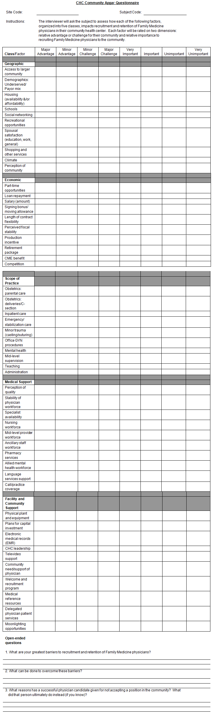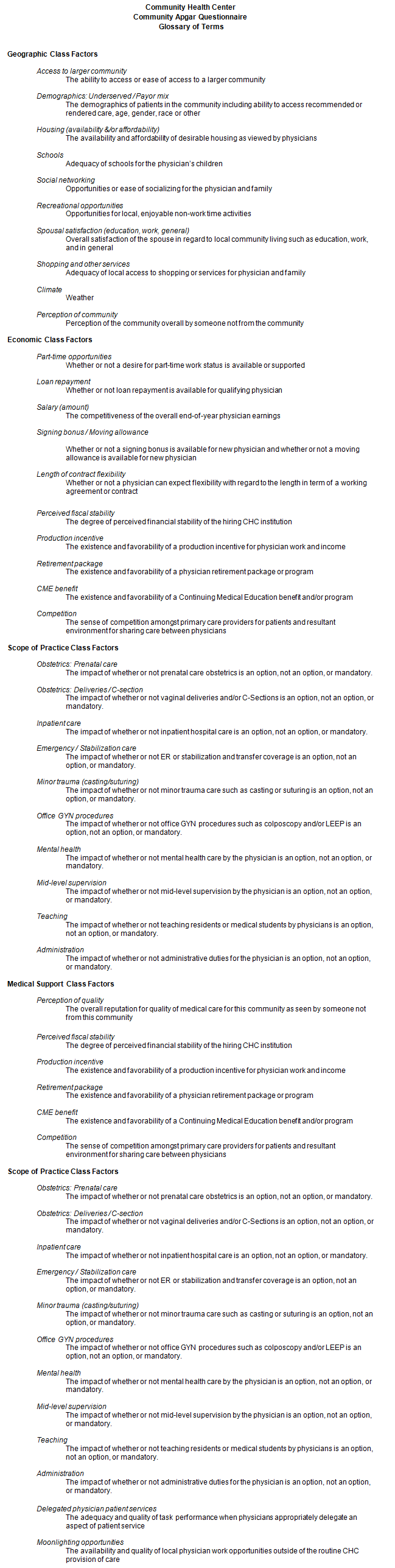 The CHC CAQ was developed based on the CAH CAQ. Researchers identified CHC-specific factors important in recruitment and retention through research, site visits to Idaho communities and discussions with physicians, CHC administrators and other professionals working to improve health care in underserved communities. As with the CAH CAQ, 50 factors were categorized into one of the following five classes: geographic, economic, scope of practice, medical support or facility/community support. Note that the hospital/community support class of the CAH CAQ was changed to facility/community support for the CHCs. Consistent with the CAH CAQ, each class of the CHC CAQ contained 10 factors. Further, 12 of the 50 (24%) CAH CAQ factors were different from those in the CHC CAQ to better represent physician recruitment and retention concerns of CHCs. These factors were housing, length of contract flexibility, perceived fiscal stability, retirement package, emergency/stabilization care, minor trauma, office gynecology procedures, pharmacy services, language services support, medical reference resources, delegated physician patient services and moonlighting opportunities. A series of three open-ended questions were also administered to validate the factors and identify any factor seen as significant but not addressed within the CHC CAQ. The CHC CAQ is provided in Appendix I and Appendix II provides a glossary of terms for the 50 factors in the CHC CAQ.