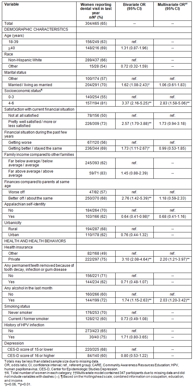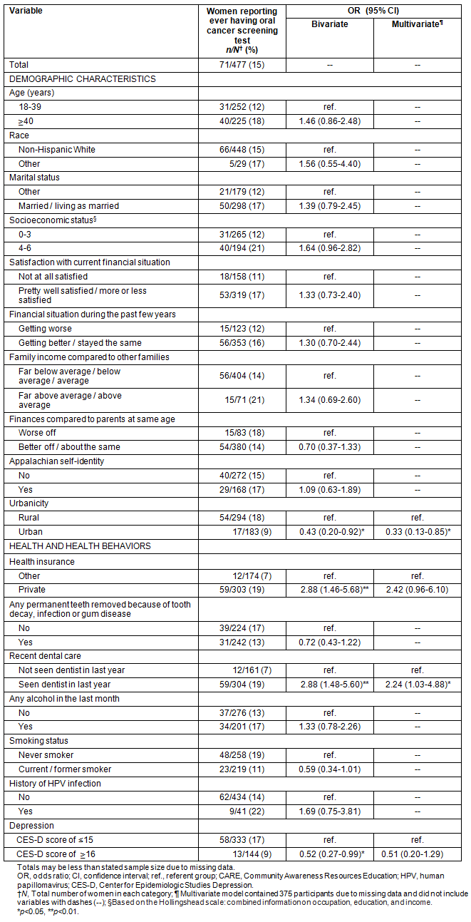 Surveys assessed a wide range of demographic factors, health behaviors and psychosocial factors given the CARE study used the Social Determinants of Health Model as its theoretical framework (Tables 1,2)26. For this article, constructs from this model and other variables thought to be potentially important to oral cancer screening behaviors were examined. The socioeconomic status (SES) measure was loosely based on the Hollingshead scale and combined information on occupation, education and income27. The SES scores ranged from 0 to 6, with a score of 4 or higher indicating high SES22. Appalachian self-identity was measured with the item, 'Do you consider yourself to be Appalachian?'28. Given HPV infection is a risk factor for oral and pharyngeal cancers, women were asked to indicate if they had ever been told by a doctor that they had an HPV infection (described to participants as venereal warts, condylomas or papillomavirus infections)2.