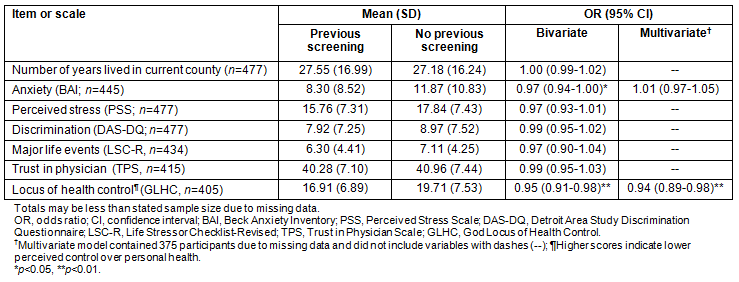 Table 2: Continuous correlates of ever having had an oral cancer screening examination (n=477)