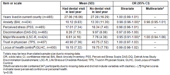Only 15% (71/477) of women reported ever having had an oral cancer screening examination (Table 1). Among those who had had a previous examination, most reported receiving their most recent examination from a dentist (80%), with fewer reporting a dental hygienist (11%) or physician (7%). Almost all women who had had a previous examination indicated their most recent examination was part of a routine dental examination (83%) or routine physical examination (13%). In bivariate analyses, women with private health insurance or who had received recent dental care were more likely to have reported having ever had an oral cancer screening examination (both p<0.01) (Table 1). Oral cancer screening was less common among women from urban areas, with depressive symptoms, greater anxiety or perceived a lower locus of control over their health (all p<0.05) (Tables 1,2).