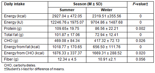 Total caloric and fat intake was found to be higher and dietary fibre lower when compared with the regular diet in India. Mean total calorie intake was 2927.04 ± 472.05 kcal in summer and 2319.51 ± 355.56 kcal in winter. Fat contributed to 34.7% of energy intake in summer as compared to 28.3% in winter (Table 1). Fresh vegetables and fruit were only available during summer. However, since frozen foods including meat, fish, poultry and vegetables (carrots, spinach, peas, corn, beans and cauliflower) were readily available, there was no significant difference in the daily staple diet. Nonetheless, the high energy intake can be explained by consumption of calorie-dense precooked meals, instant noodles, biscuits and canned foods during field work in place of routine meals or as snacks in summer. Smoking and alcohol consumption were not found to have any correlation with the development of GD.