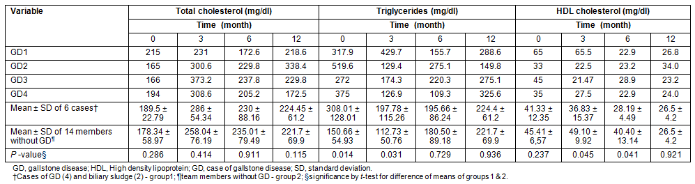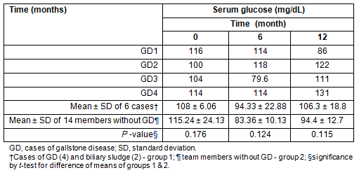 Dyslipidemia including hypertriglyceridemia in four subjects (20%), hypercholesterolemia in nine subjects (45%) and low HDL cholesterol in six subjects (30%) was seen to develop after 3 months of polar residence. The normal range for serum cholesterol (180 ± 37 mg/dL), HDL cholesterol (44 ± 13 mg/dL) and triglycerides (119 ± 62 mg/dL) are as per age and sex matched Indian population means7. The mean triglyceride and HDL cholesterol were significantly higher and lower, respectively, in the group with GD than in those without (p< 0.05). We found no association between high total cholesterol levels and risk of developing GD (Table 2). Impaired fasting glucose was found in three subjects (15%), two of whom developed gallstones (Table 3).