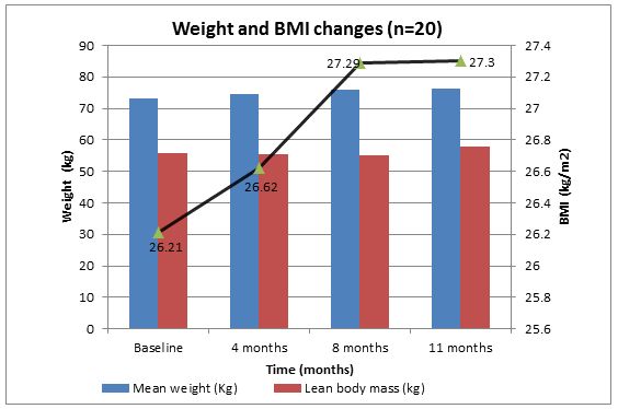 Figure 1: Changes in mean weight, BMI and lean body mass over one year of Antarctic residence.