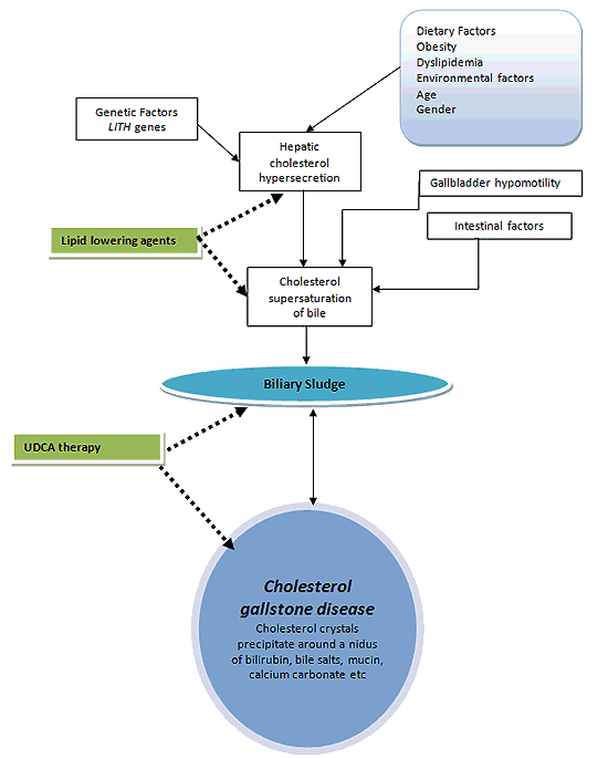 Figure 3: Multifactorial pathogenesis of cholesterol gallstone disease. The crucial stages in the formation of gallstones are