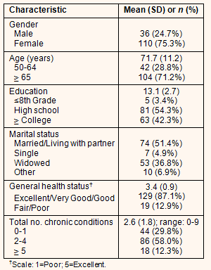 Demographic and general health information on participants is presented (Table 1). The majority of respondents (75.3%) were women. Over 70% of the rural adults were 65 years of age and older. The average number of years of education completed was 13.1 (SD=2.7), with only five respondents indicating education at the eighth grade level or below. Over one-half of participants (51.4%) were either married or living with a partner, with 36.8% widowed. Overall, our study had an over-representation of women compared to the average proportion of women in the targeted counties and the state: 50% and 51%, respectively. The percent of high school graduates (96.6%) was also higher than that for the targeted counties (87%) and for Illinois as a whole (86.2%).