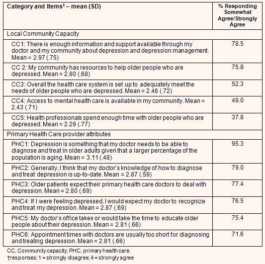 The mean values as well as percentage of somewhat agree and strongly agree responses to five questions on local community capacity (CC) for mental health and depression support as well as six questions on assessment of primary health care (PHC) physician attributes related to depression management are presented (Table 2). Nearly 80% of respondents indicated there was enough information and support from their physician and in the community about depression and depression management and three-fourths further agreed the community has resources to help older people who are depressed. However, only one-half of respondents agreed that, overall, the healthcare system is set up to adequately meet the needs of older depressed people and that access to mental health care is available in the community. Less than 40% agreed that health professionals spend enough time with older people who are depressed. These community capacity responses (CC1 to CC5) were combined into an overall indicator of perception of supportive community capacity by adding the five items together and dividing by number of responses. The result was a mean score of 2.60 (SD=0.40; range = 1.40-3.75) on a scale with a potential range from a low of 1 to a high of 4, indicating a moderately positive assessment of community capacity.