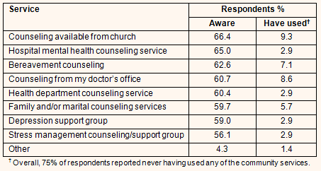 The older adults tended to be aware of mental health and depression support services in the community, although at least one-third of respondents indicated not being aware of counseling from a church and hospital services and a little over 40% were not aware of any depression support groups in the community (Table 3). Nearly 75% of respondents reported never having used any of the mental health services. For those who did use services, church counseling, which most respondents also reported they were aware of, was most often utilized - by 9.3% of the older adults. Other services more often used were counseling from the doctor's office (8.6%), bereavement counseling (7.1%) and family or marital counseling (5.7%). Only 2.9% of respondents mentioned use of a depression support group or of a stress management group, respectively.