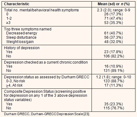 Focusing specifically on depression status, 23 respondents, or 17.8%, indicated that at some point they had been diagnosed with depression by a physician or other healthcare provider. Sixteen participants, or 11%, reported depression as a current chronic condition. Additionally, 17 of the 150 respondents, or 11.3%, scored in the range for possible current depression on the Durham GRECC scale for assessment of depression symptoms. When combining the results of the three depression assessments, 35 respondents (23.3%) showed evidence of depression or being at-risk for depression. In terms of point prevalence, 26.4% of women were at-risk for depression compared to 13.9% of rural men.