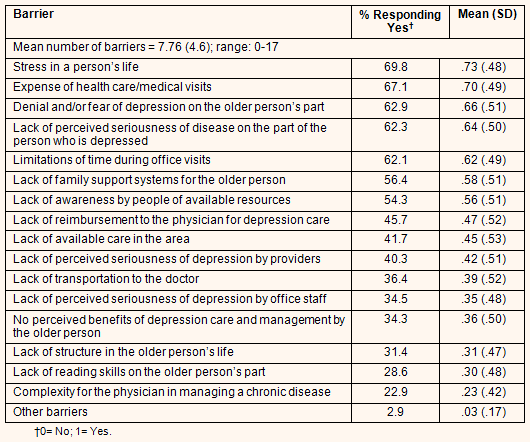 Stress in a person's life and expense of health care were the most frequently mentioned barriers to effective management of depression by the rural respondents. One is a more personal and the other a more structural or systems barrier. Of the top five reported barriers, three were of a personal nature: in addition to stress were denial or fear of depression and lack of perceived seriousness of the disease. Importantly, all of the top five barriers were mutable; that is, these barriers to effective management of depression can be approached and solutions sought through education and changes in the delivery of healthcare services. When asked about the single most important barrier to depression care, nearly one-half of older adults identified a personal or psychological obstacle, including denial/fear and stress.