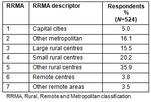 The majority (79%, n=414/524) of respondents lived in the higher population density states NSW (35.1%, n=184/524), Victoria (22.7%, n=119/524) and Queensland (22.5%, n=118/524). The distribution of respondents by rurality is shown in Table 1.