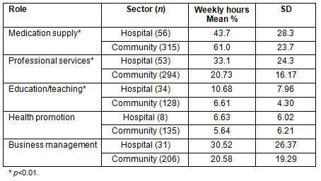 Over one-third (37.7%, n=198/524) of respondents reported working more than 40 hours per week, and of these 13.9% (n=73/524) reported working over 51-60 hours per week. Several significant differences emerged between community and hospital pharmacists when respondents were asked to specify the proportion of weekly hours allocated to different tasks (Table 2). Hospital pharmacists reported they spent significantly more time on the delivery of professional services and education and teaching, and less time on medication supply than pharmacists working in the community sector. Not surprisingly, within the community pharmacy sector, employees undertook significantly more medication supply (70.0% weekly hours) than owners (54.3 % weekly hours, p<0.01), and owners carried out significantly more business management (22.5% weekly hours) than employees (11.3 % weekly hours, p<0.01).