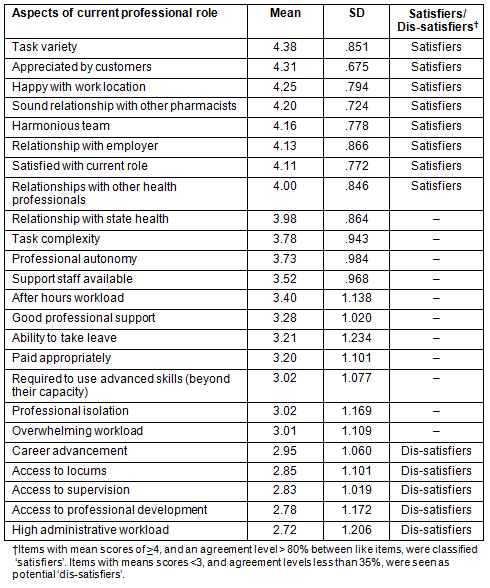 Professional satisfaction was measured by asking respondents (n=389-558) to indicate the extent of their agreement with 24 statements about their current pharmacy practice, on a five-point Likert-scale. Rural/remote pharmacists were generally found to be satisfied with their current role. The main 'satisfiers' were task variety, being appreciated by customers, ability to use advanced skills, appropriate remuneration, happiness in the work location, sound relationships with other pharmacists, a happy team and relationships with other health professionals (Table 3).