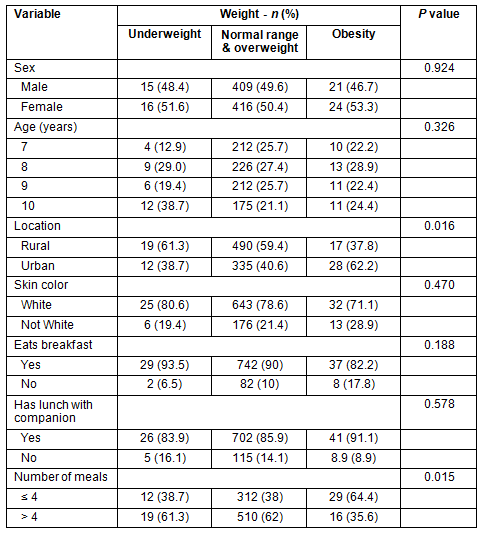 A prevalence of 3.4% underweight and 5% obesity was found, with no statistically significant differences observed for sex, age, skin color or for the presence or not of a companion during meals. School children who were classified as obese were less likely to eat breakfast but this was not statistically significant.
