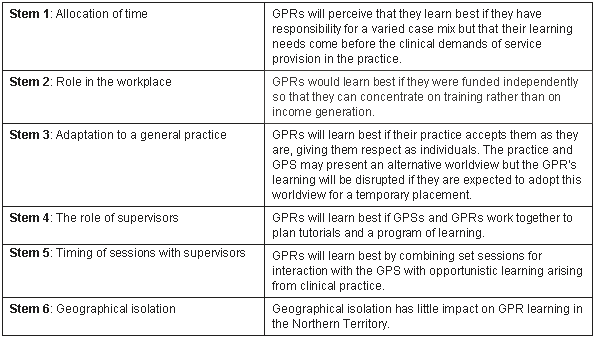 The interviewer was known to the GP registrars through her role as training advisor and GP educator in Alice Springs, NT. From experience in the field an expected answer to each stem was hypothesised and documented prior to conducting the interviews (Fig 3). In this way it was possible to make a comparison between the participants' and interviewer's ideas to identify the introduction of bias.