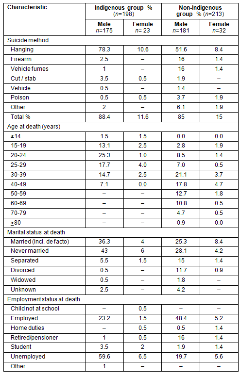 Hanging was the primary means of suicide, with the Indigenous group much more likely to use this method than the non-Indigenous group (89% Indigenous, 60% non-Indigenous). In contrast with relatively high rates of firearm-related suicides reported in rural areas, in this sample 17% of non-Indigenous coroners' cases died using a firearm but only 3% of Indigenous cases32. The age at death was substantially younger for the Indigenous sample. There were similar percentages across those who were married or in de-facto relationships as those never married in both Indigenous and non-Indigenous groups.