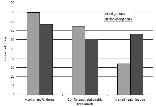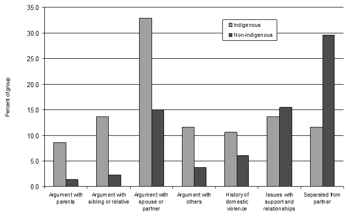 Descriptions of longer term history of conflict included domestic violence in 11% of Indigenous and 6% of non-Indigenous cases. Separation from partner showed the opposite trend, with mention in 12% of Indigenous cases and almost 30% of non-Indigenous cases. Other general concerns with support and relationships were reported in similar numbers (14% Indigenous cases and 16% Non-Indigenous cases).