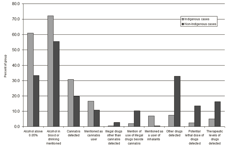 In keeping with recent research in Queensland, the reverse pattern was present for illegal drugs (other than cannabis), which were identified in 0.5% Indigenous and 2.8% of non-Indigenous cases4. Prescription and over-the-counter medicines were detected in 8% and 33% of cases, respectively, and potentially lethal levels of drugs/substances were detected in 2.5% and 14% of cases.