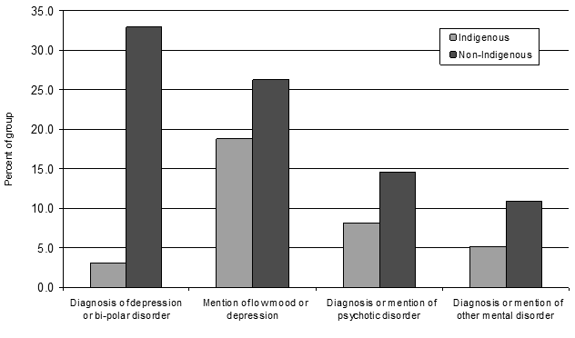 The greatest difference between Indigenous and non-Indigenous cases was for cases in which there was evidence of a diagnosis or treatment for major depressive disorder or bi-polar disorder. For example: