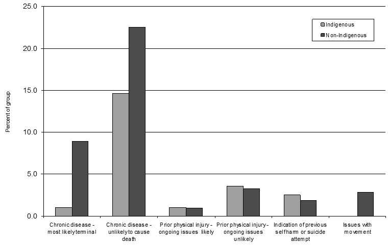 While the limited role of physical illness has been noted in Indigenous suicide4, in this case the lower incidence of chronic disease evidenced in Indigenous suicide cases is most likely due to the younger age of the Indigenous cohort (with no cases over the age of 50 years). It is unlikely to be reflective of poorer access to services and treatment since findings arose from autopsy reports rather than medical records. In general, it would appear that physical illness issues were not as strongly associated with suicide as other factors for the current sample.