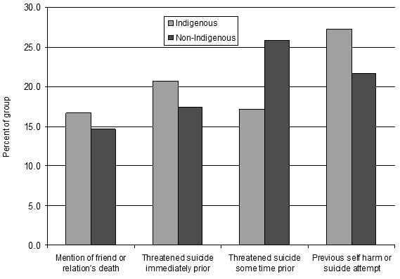 As well as threatening to commit suicide, approximately a quarter of cases (27% of Indigenous and 22% of non-Indigenous) had attempted suicide previously. It would appear that personal and social precedents of suicide are important considerations. Likewise, as with relationship breakdown, the importance of social factors in suicide prevention (and postvention) should be noted, and this may have particular relevance to smaller rural and remote communities.