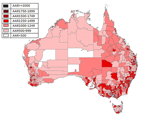 Population data across each of the 1353 SLAs were distributed by age, health insurance status and SEIFA. Using Excel v2003 (Microsoft; Redmond, WA, USA), the hospitalisation rate for each population subset derived from the Western Australian morbidity data was applied across Australia to the appropriate population subset (age, health insurance status, SEIFA) within each SLA.