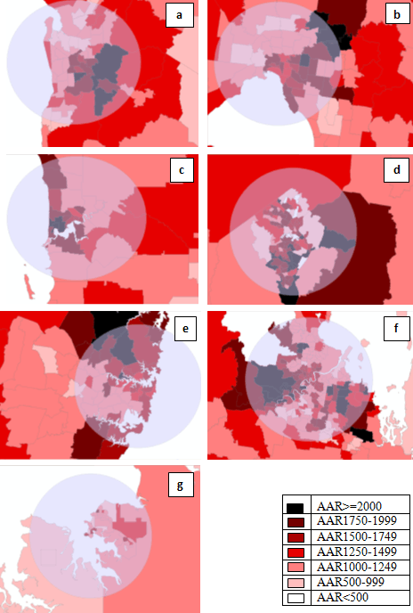 A clear rural-urban divide with the age-adjusted rates (AAR) being higher in the metro-city SLAs when compared to the rural-remote SLAs is shown using maps (Fig1). A 25 km buffer was drawn around the metro General Post Offices (GPOs) to compare the rates between those residing closer to the city and those away from it. Approximately 37% of the SLAs were within the 25 km buffer and approximately 63% of them were outside the buffer zone. A clear contrast is shown with higher rates noted in those SLAs closer to the city when compared to those away from it (Fig2). Age-adjusted rates were calculated for those within the city buffer, which was 1363 per 100 000 persons when compared to 1175 outside the buffer zone.