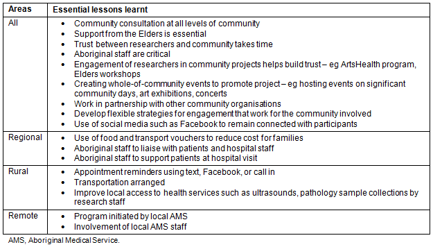 As the authors' research program has expanded to other locations, it has become clear that each Aboriginal community has specific needs and that the research design and daily management needs to cater for this to ensure the success of any program. Key strategies that have worked in each location are shown (Table 1).