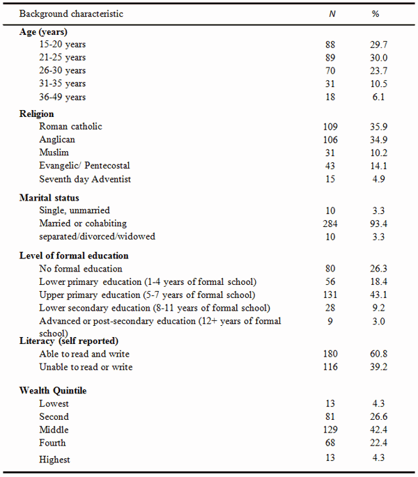 Design and sample size: This was a cross-sectional study focusing on anaemia levels among women of reproductive age (15-49 years). The population size from which the sample was drawn was estimated to be 5400, based on the estimated pregnancy rate (5.2%) and anaemia prevalence among pregnant women in Uganda (64.4%). The sample size was computed using the formula used by Leslie15; 64% was used for prevalence of anaemia, as adopted from the UDHS 20066. The sample size of 276 was calculated. However, a 10% non-response rate raised the sample size to 304. A sample size of 304 was achieved; however, the actual non-response rate was 2.6%.