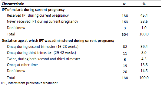 Intermittent preventive treatment of malaria: Less than half of the respondents (45.4%) reported having taken anti-malarial prophylaxis (Table 3). Of those, only 4.3% had received the recommended two doses during both second and third trimesters of pregnancy, with the majority (54.9%) receiving only one dose of IPT and within the second trimester.