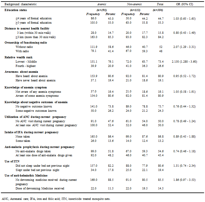 Anaemia by background characteristic: Anaemia was more prevalent among women in the second and third trimesters of pregnancy (63.3%). Generally respondents with primary education had a higher prevalence of any anaemia compared with those without formal education and those of higher levels of education. Respondents who were distant from the nearest health centre were more likely to be anaemic. Anaemia was more prevalent among women from households that did not have a radio.
