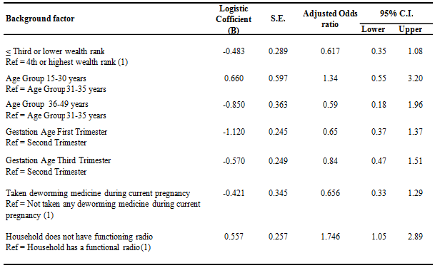 Bivariate analysis: Most factors did not have significant influence on the anaemia status of respondents (Table 4). However, ownership of radio and relative wealth ranking exhibited some influence on anaemia status (p<0.05). The results suggest that those without a functioning radio were 2.07 times more likely to have anaemia than those who had a functioning radio. Pregnant women from households in the lower three relative wealth quintiles were 2.15 times more likely to have anaemia than those from higher category rankings. Women who had not received de-worming medicine during their current pregnancy were 1.86 times more likely to be anaemic compared with those who had received a de-worming tablet, the association was, however, not found to be statistically significant.