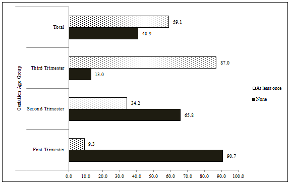 Timing and frequency of ANC visits: Sixty percent of pregnant women had made at least one ANC visit (Table 2), the majority of which were in the third trimester of pregnancy (Fig1). Only 9.3% and 34.2% of respondent women in the first and second trimester, respectively, had made an ANC visit (Fig1). Among those who had an ANC visit, the median gestational age at the first ANC visit was 5 months. The total number of ANC visits made by respondents in the third trimester of pregnancy (n=47) were further examined. While 43.5% of the respondents attended ANC at least once, only 6.1 % made the recommended minimum of four ANC visits (Fig1).