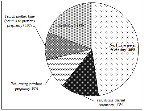 Iron/folic acid (IFA) supplementation: Forty-eight percent of the respondents had never taken IFA but 13.2% women had taken IFA during the current pregnancy (Fig2). Among those who had taken IFA during the current pregnancy, only 9 of 40 respondents knew how many pills they had taken.
