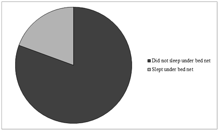 Use of insecticide treated nets and de-worming medicine: Only 1 in 5 pregnant women slept under mosquito nets (Fig3). Only 14.5% of respondents had received any de-worming medication although majority of respondents were already in the third trimester of pregnancy.