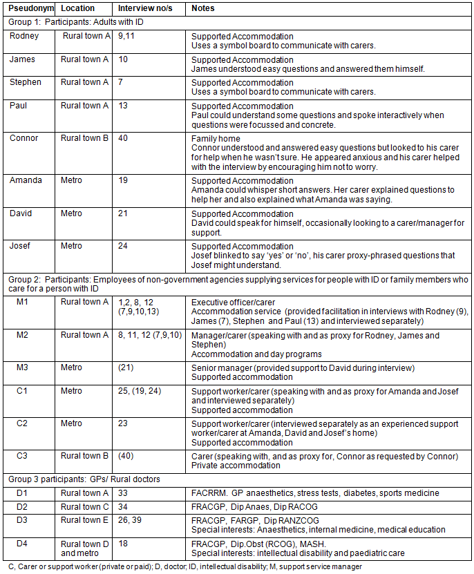 Theoretical sampling of interview participants was used to ensure the views of rural doctors and people with ID from rural and urban settings were captured. Data were triangulated through the inclusion of perspectives from managers of disability services and from carers and support workers (identified collectively as carers) in both rural and urban settings to clarify factors specific to rural areas.