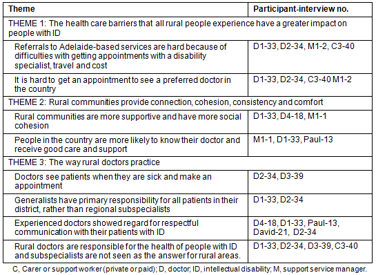 Seven broad themes emerged relating to the role of the Medicare health assessment for people with ID, doctors and carers. A description is presented of the first three themes relating to the nature of rural communities and rural practice (Table 2). Each theme is presented with an outline of its sub-categories and the interviews in which the categories were coded.