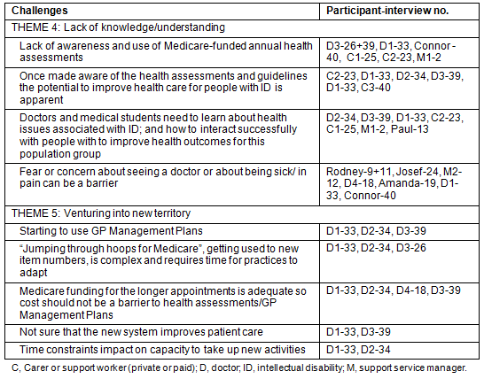 General practitioners' lack of expert knowledge about ID may be another contributing factor. Three of the four doctors interviewed did not have expertise in ID. Only one rural doctor participant who had a special interest in ID, said he recommended the annual health assessments to clients. No other doctors in this study had considered how patients with ID could benefit from this Medicare initiative. Although the study sample size was small, these findings correspond with other studies which show that GPs do not have good knowledge of the health needs of people with ID, despite acknowledging their responsibility toward these patients17. People with ID can make an appointment through the Centre for Disability Health (CDH) in Adelaide. The CDH clinics use comprehensive health assessments for their patients, but the distance and complexity of travel to Adelaide, as well as prioritisation of clients with more complex needs, make access difficult for people in the Riverland region.