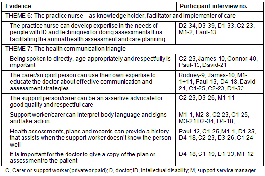 Finally the data analysis involved an iterative process of interviews, self-reflection and discussion among the researchers about the data and to what extent particular responses should be included, to ensure that the voices of people with ID were neither overlooked nor overstated. Data were considered important to the study question where they illustrated the complexity of providing care as one of the benefits of comprehensive annual screening and where participants' comments or non-verbal communication revealed something of their experience of the health system, again, as context for this study. In summary, while not all participants could contribute to the same degree in terms of understanding the intent of the research, to the extent that they could understand and answer questions facilitated by the carer, this was experienced by the interviewer as valid and genuine participation and is presented as such in the results and discussion.