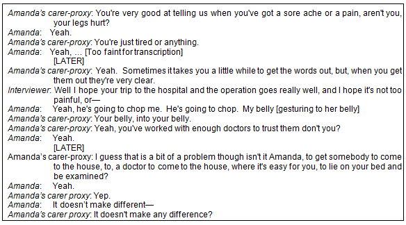 An example is provided of how the interviewer sought to ask questions directly (to Amanda) in a way that could be understood; and how the carer-proxy facilitated (Fig1). While it is often unclear whether Amanda understood questions because she often simply agreed, she sometimes expressed concern or a contrary opinion.