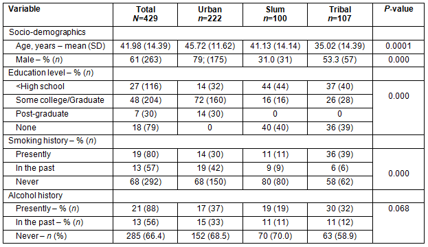 The study enrolled a convenience sample of 429 people aged 18 years and over across urban, slum and tribal settings of Bhubaneswar and Rourkela in the State of Orissa. Fifty-two percent (n=222) of the sample were from urban settings, 23% (n=100) were from slum settings and 25% (n=107) were from tribal settings. Those in the urban setting were older and the majority were female. Participants enrolled from the slum settings were predominantly female (Table 1).