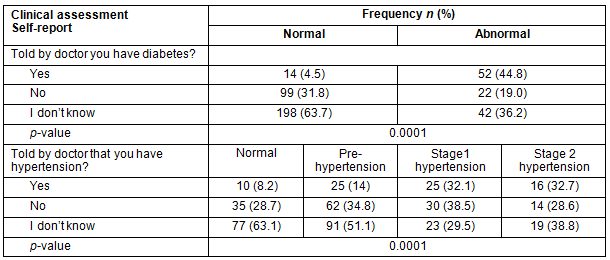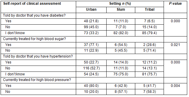 In the self-report clinical assessment, more than half of the participants didn't know if they had diabetes or not (56%; n=240). Similarly approximately 49% (n=210) of participants didn't know if they had hypertension or high blood pressure. Overall, the prevalence of diabetes was 16% (n=66) and that of hypertension was approximately 18% (n=76). Of those who had diabetes, 32% (n=21) of them were not treated for high blood sugar. Similarly, of those who had high blood pressure, 33% (n=25) of them were not treated for it. Significant differences were seen in the burden of diabetes, blood sugar and their current treatment among those those living in urban, slum and tribal settings. The burden of diabetes and hypertension was significantly high in the urban setting than in the slum and tribal settings (Table 2).