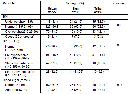 Participants in the urban setting were significantly overweight (32%, n=70) compared with those in the slum (10%, n=10) and tribal settings (12%, n=13) (p=0.0001). Seventy-one percent (n=305) of participants had either pre-hypertension (42%, n=178), stage 1 hypertension (18%, n=78) or stage 2 hypertension (11%, n=49), and 27% (n=116) had abnormal blood sugar levels. A high prevalence of pre-hypertension, and stages 1 and 2 hypertension were found among those living in the slum and tribal settings (Table 3).