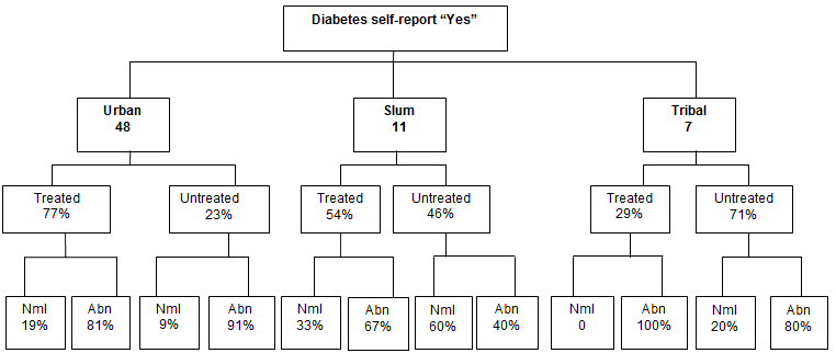 Almost half of the people in slum areas who had self-reported diabetes were left untreated, and 40% of them had abnormal blood sugar readings. In tribal areas, 71% of positively self-reported diabetics were untreated and 80% of them had abnormal blood sugar levels. In the slum setting, 57% of self-reported hypertension was untreated, and 62.5% of respondents had abnormal blood pressure readings. Similarly, 58% of respondents in the tribal setting hadn't been treated, with 86% having abnormal blood pressure readings.