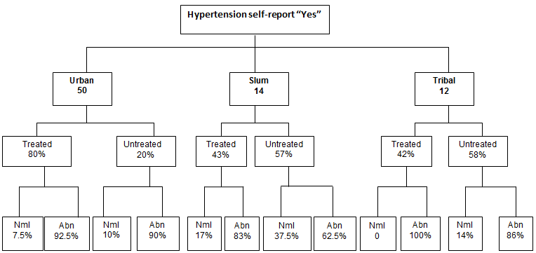 Further analysis was performed to assess if those who had self-reported having diabetes had received any kind of treatment, and on the status of their blood sugar levels (Fig2). Results have shown that almost half of the people in slum areas (n=5) who had self-reported diabetes were left untreated, and 40% (n=2) of them had abnormal blood sugar readings. The reality is even more worrisome for inhabitants of tribal areas, where 71% (n=5) of positively self-reported diabetics were untreated, with 80% (n=4) of them actually presenting with abnormal levels of sugar in the blood. In urban areas, 77% (n=37) of the people who answered 'yes' to the diabetes self-report were treated, and the number who had abnormal readings was 81% (n=30). In the case of those who self-reported hypertension (Fig3) in the slum setting, 57% (n=8) went untreated and 62.5% (n=5) had abnormal blood pressure readings. Similarly, in the tribal setting 58% of the respondents hadn't been treated. Of those, 86% had abnormal blood pressure readings. Finally, in the urban areas, 20% of self-reported hypertensive participants were untreated, with 90% of this group having abnormal blood pressure readings.