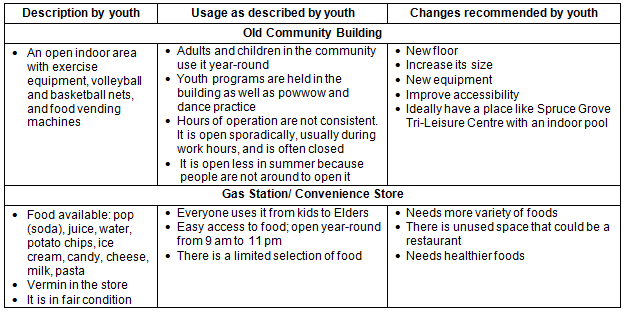 Table 1: Two places identified by youth for improvement in Alexander First Nation during visual asset mapping