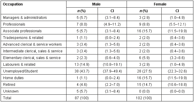 Contact rates were low at 50%. Where contact was made, however, consent rates for participation in the study were high, approximating 85%. Over the one-year period in which the prevalence study took place, 80 participants (40% of those selected from the initial proportional random sampling strategy) were able to be assessed. Although this poor contact rate may compromise the ability to generalise the findings of this study, the limitation appeared unavoidable and itself highlights an issue intrinsic to rural and remote health research25. To supplement the process of recruiting community members, a convenience sample was also recruited. This strategy was informed by the experience of other researchers working in the area of Aboriginal health25. Donovan and Spark noted that the question of sampling in many Aboriginal communities can be complex if the perspective is to recruit a random sample of the community25. Their recommendation is 'a perspective of representativeness' which involves some elements of randomness, but is based primarily on 'ensuring that all families and groups in the community and outstations in the group are represented in the sample'25. The present study consisted of a mixture of both approaches. When compared with the community census conducted by the Kempsey Shire, the study sample represented an acceptable cross-section of the community22.