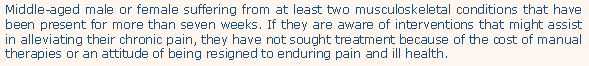 Throughout the world, musculoskeletal health problems are a major morbidity issue for Indigenous populations13 and the social and economic burdens imposed by musculoskeletal complaints are significant13. Musculoskeletal conditions may involve all muscle and joint structures and commonly include low back pain, neck and shoulder pain, upper and lower extremity syndromes and degenerative conditions such as osteoarthritis14. Musculoskeletal conditions of 'mechanical' origin, that is, those that are associated with physical trauma or stress to the human frame, particularly those classified as chronic (of greater than 7 weeks' duration) are frequently associated with pain and disability15. These conditions are commonly characterised by symptoms of pain, tenderness, swelling or stiffness of joints or muscles15. Little research has been performed on the prevalence and associated pain and disability of musculoskeletal conditions among this most disadvantaged Australian population.