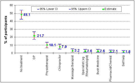 Approximately 50% of community members who reported experiencing pain had not accessed any treatment for their musculoskeletal condition (Fig 2). The most common reasons given were that they had 'learnt to live with the problem', that they were 'unaware of what might help them', or a belief that 'private therapies were too expensive'. People living in rural, Indigenous communities report particular limitations to accessing healthcare services. Among these are physical, economic, cultural and personal barriers. To date there are no data for comparison with other Indigenous or non-Indigenous groups and this represents an important area for future research.