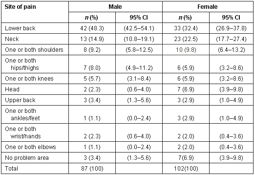Musculoskeletal conditions were widely experienced in this Community. Most respondents 95% (95% CI: 92%-97%) reported that they had experienced pain in at least one main site in the 7 days prior to the study (Table 2). Lower back pain (LBP) was the most commonly reported musculoskeletal condition among both male and female participants at 39% (95% CI: 75%-86%).